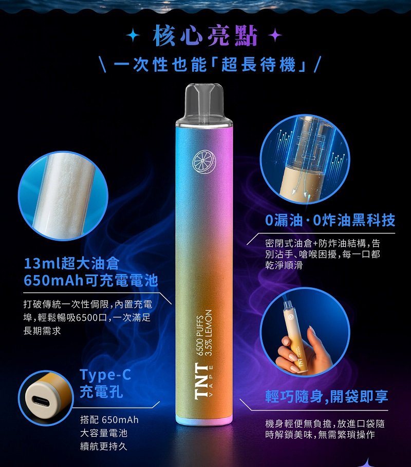 • 13ml超大油倉+650mAh可充電電池:打破傳統一次性侷限,內置充電埠,滿電輕鬆暢吸6500口,一次滿足長期需求
